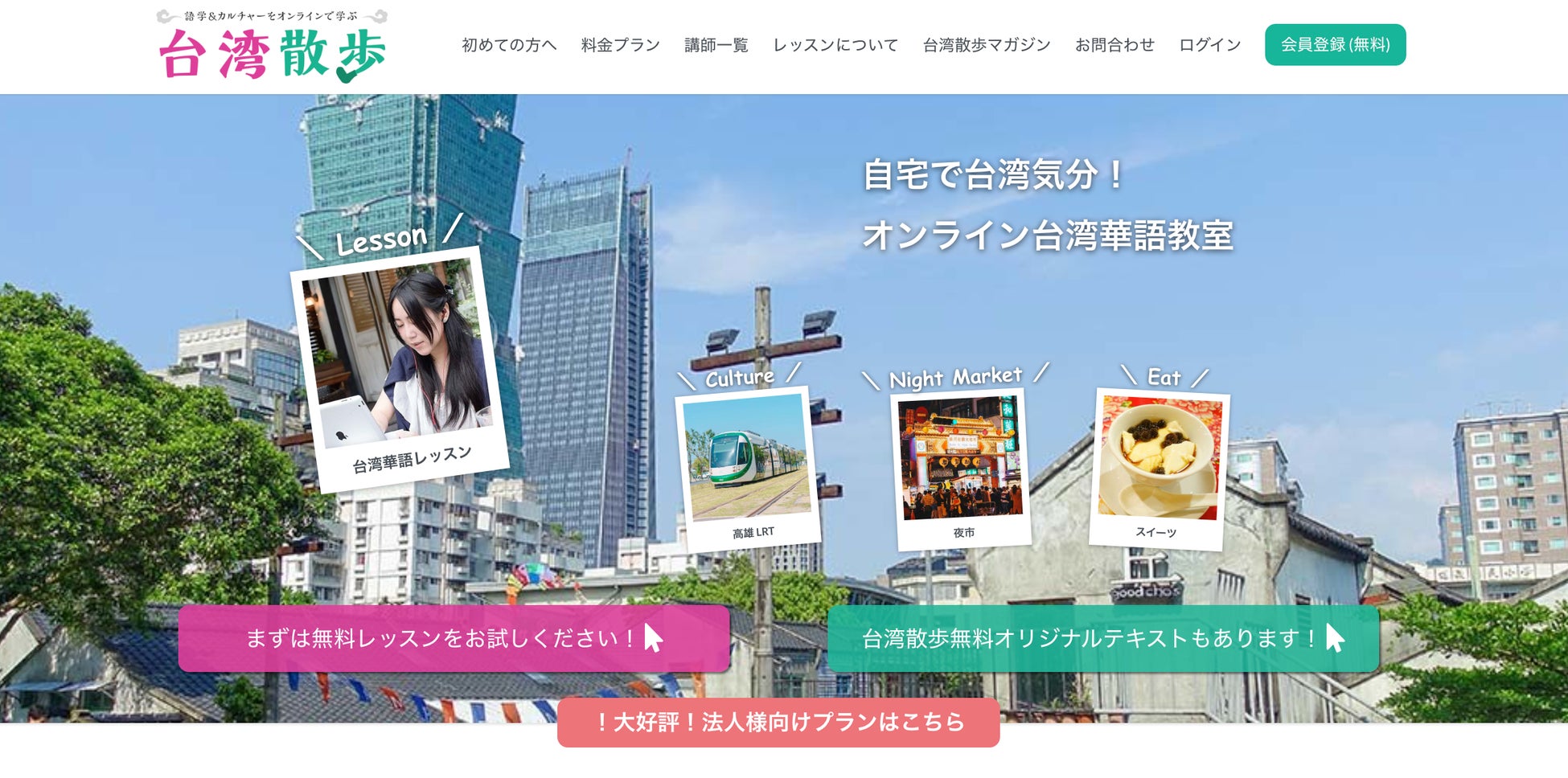 「台湾散歩」は、パソコンでもスマートフォンでも簡単に自宅でレッスンが受講できる、オンラインの台湾華語(中国語)教室です。 マンツーマンで流暢に日本語が話せる台湾人の講師がレッスンします。初心者から上級者まで対応、各自のレベルや目標、スピードに合わせたカリキュラムでレッスンを進めます。