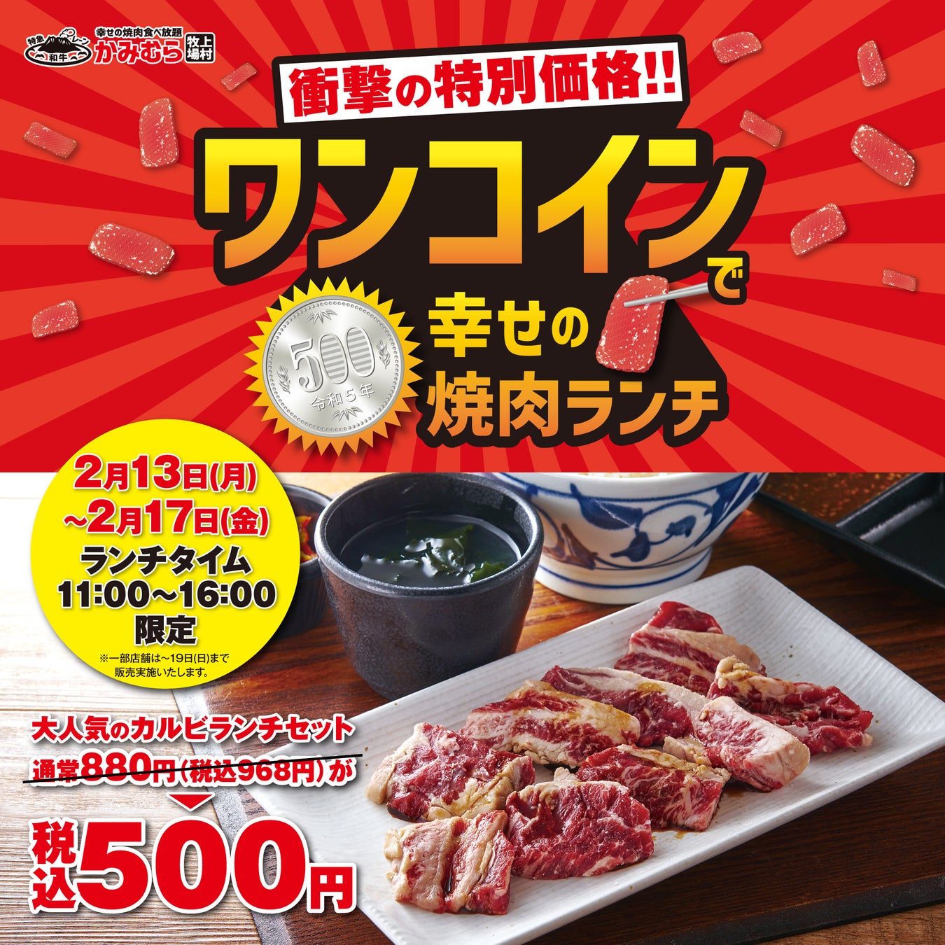 そんな「かみむら牧場」はこの度、昨今の原材料価格の高騰や物流費、水光熱費などの上昇、及び為替変動の影響から様々な価格高騰が続いている中、コロナ禍で脚が遠のいてしまった外食の機会を取り戻すきっかけや、少しでもリーズナブルに焼肉を食べていただく機会を提供したいという思いから、2023年2月13日(月)から2月17日(日)までのランチタイム(11:00~16:00)に、全国の「かみむら牧場」11店舗で「ワンコイン焼肉ランチ」を提供することを決定しました。