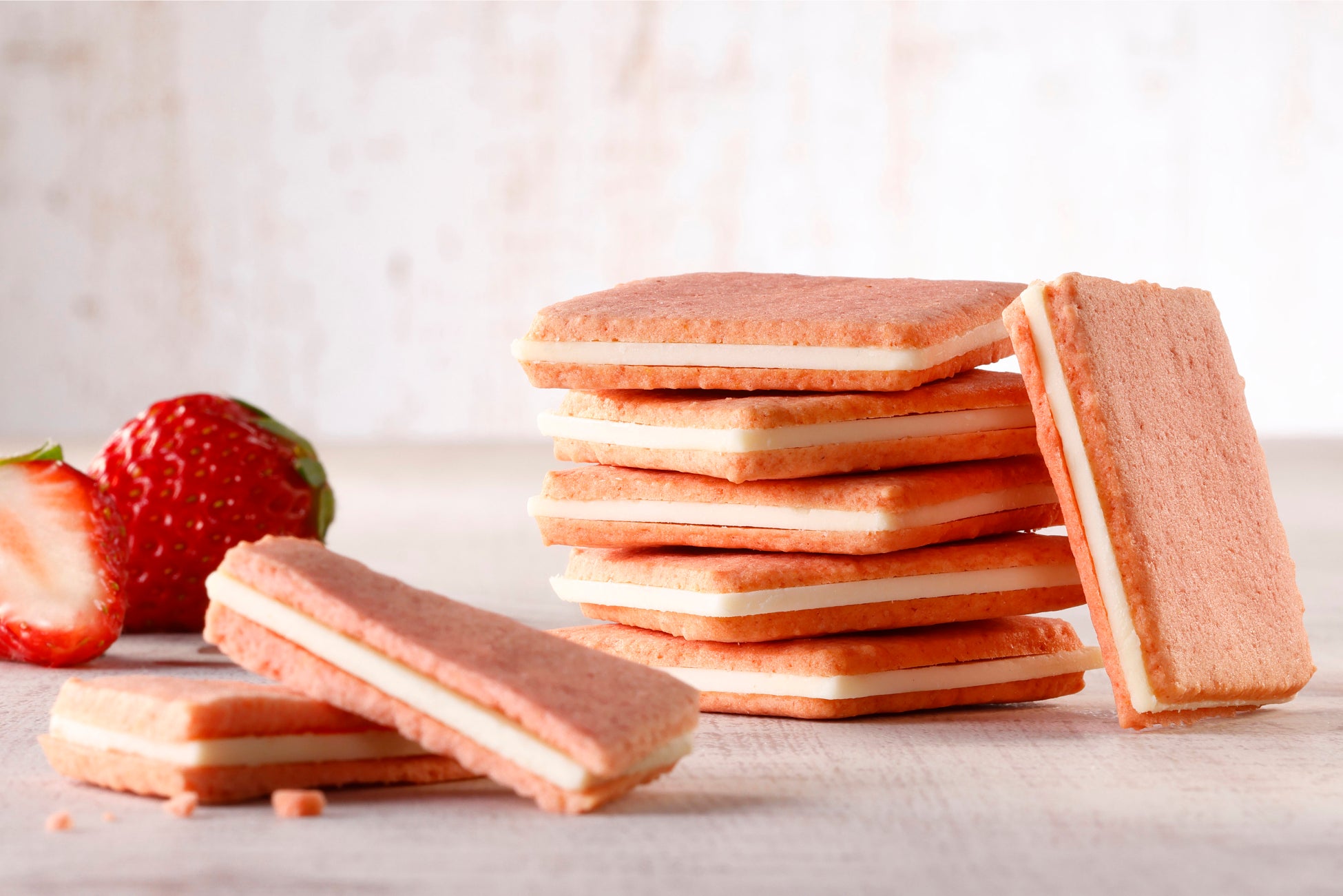 ストロベリークッキーでミルク感のあるやさしい甘さのマスカルポーネチーズ風味のチョコレートをサンドした、サクサク食感のクッキーです。