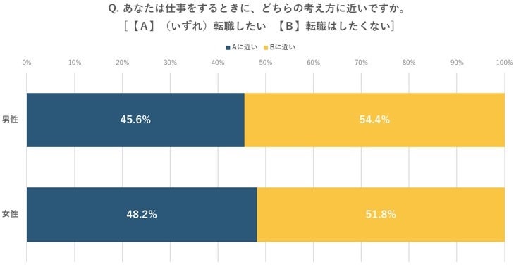 ジェンダー別の転職志向について、「(いずれ)転職したい」と答えた割合は男性45.6%、女性48.2%だった。