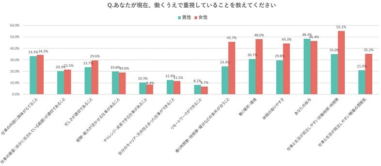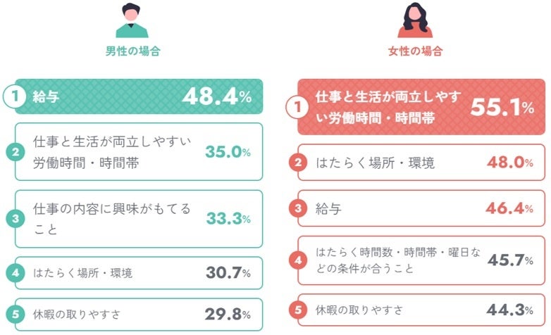 「働くうえで重視していることは?」という質問について、男性は「給与」、「仕事と生活が両立しやすい労働時間・時間帯」、「仕事の内容に興味が持てること」、「はたらく場所・環境」、「休暇の取りやすさ」の順で重要だと回答した割合が高く、女性は「仕事と生活が両立しやすい労働時間・時間帯」、「はたらく場所・環境」、「給与」、「はたらく時間数・時間帯・曜日などの条件が合うこと」、「休暇の取りやすさ」の順で高かった。