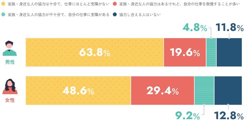 家事・子育ての協力体制について、「家族・身近な人の協力は十分で、仕事にほとんど支障がない」と答えた割合が、男性は63.8%だったの対し、女性は48.6%と大きな差があった。