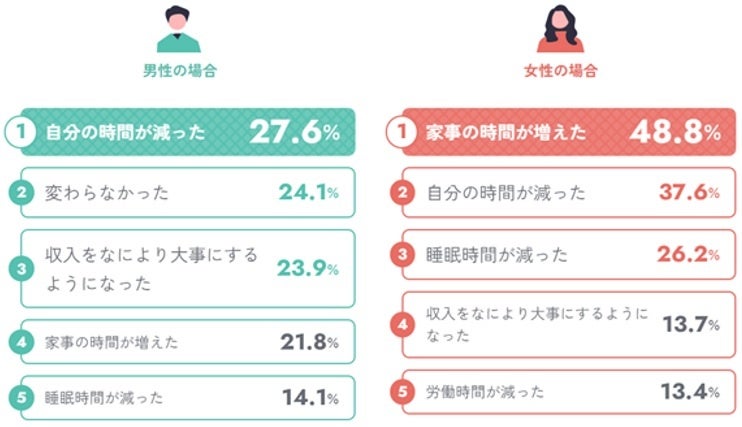 「【結婚後】、あなたのはたらき方に変化はありましたか?」という質問で、男性は「自分の時間が減った」と答えた人が最も多く、27.6%。女性は「家事の時間が増えた」と答えた人が48.8%でトップだった。