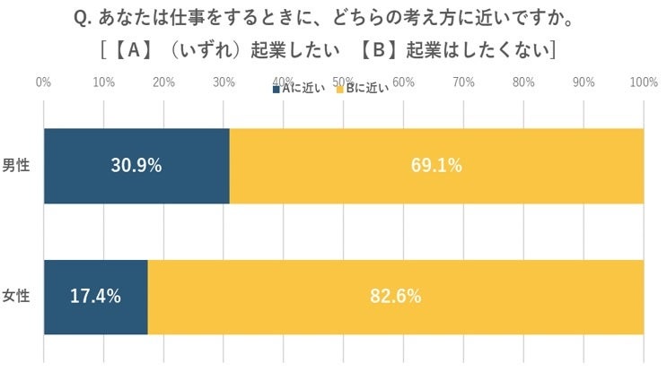 ジェンダー別の起業志向について、「(いずれ)起業したい」と答えた割合は男性30.9%、女性17.4%と、大きな差があった。