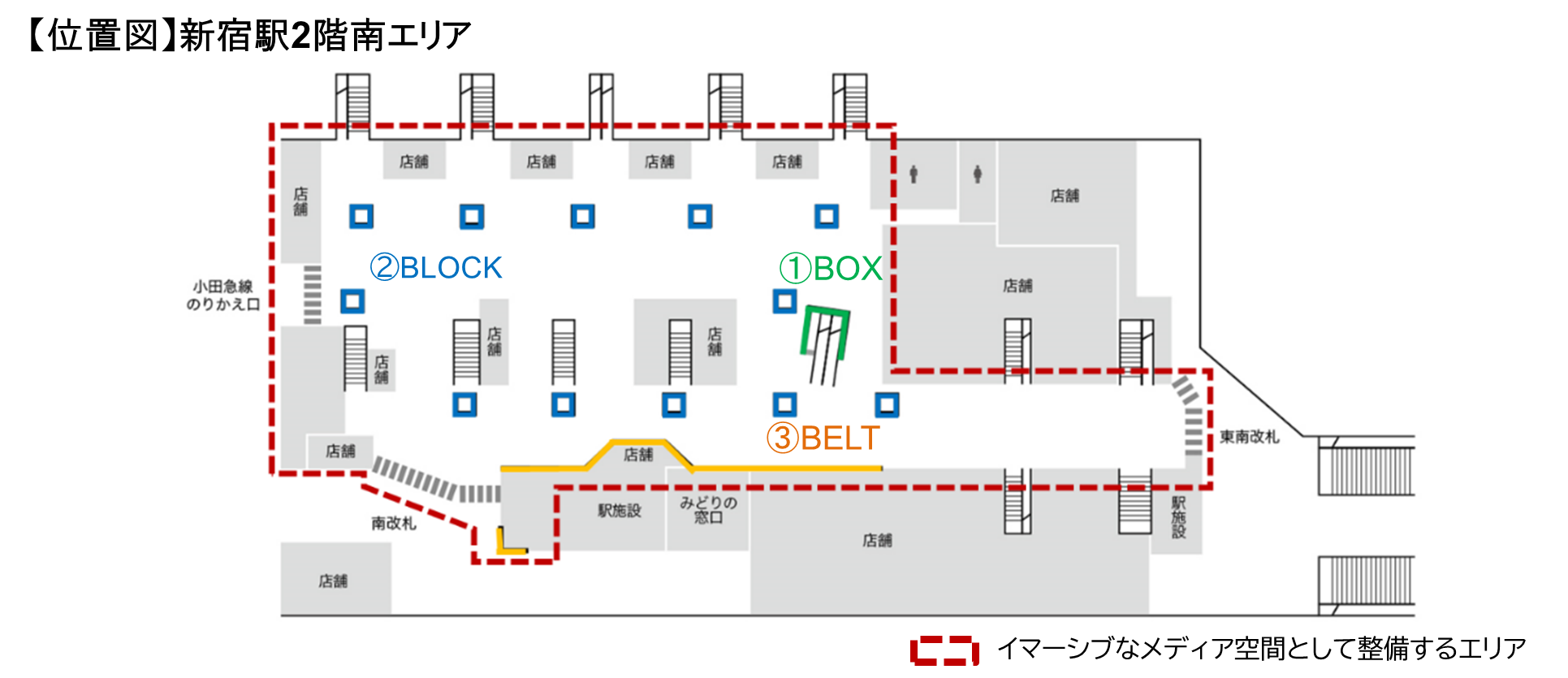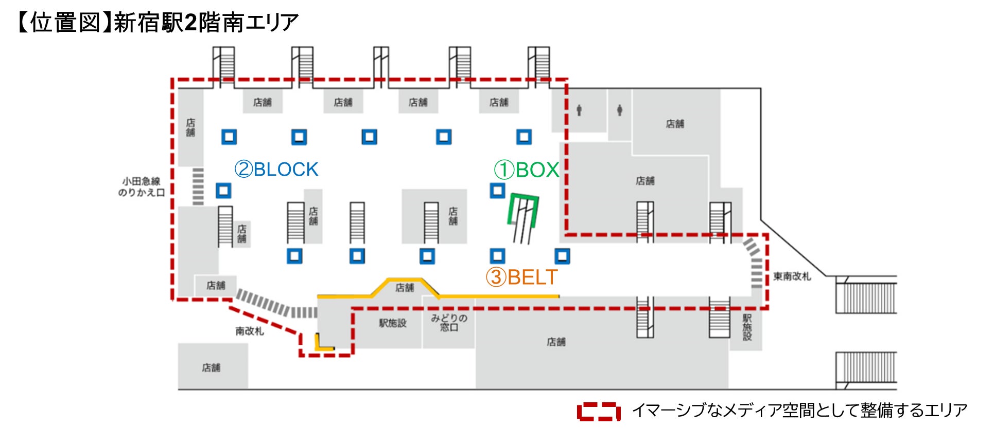 「新宿BBB」は3つの特徴的な大型サイネージ(BOX、BLOCK、BELTで総面積約250㎡)を駅構内に配置することで空間全体をジャックできる独自性の高いメディアです。世界最多の乗降客数を誇る新宿駅をご利用されるお客さまに向けて、空間全体でダイナミックな広告や空間演出などのコンテンツを放映することで、圧倒的なリーチと強く記憶に残るメッセージが届けられる唯一無二のメディアとしての存在価値の確立を目指します。