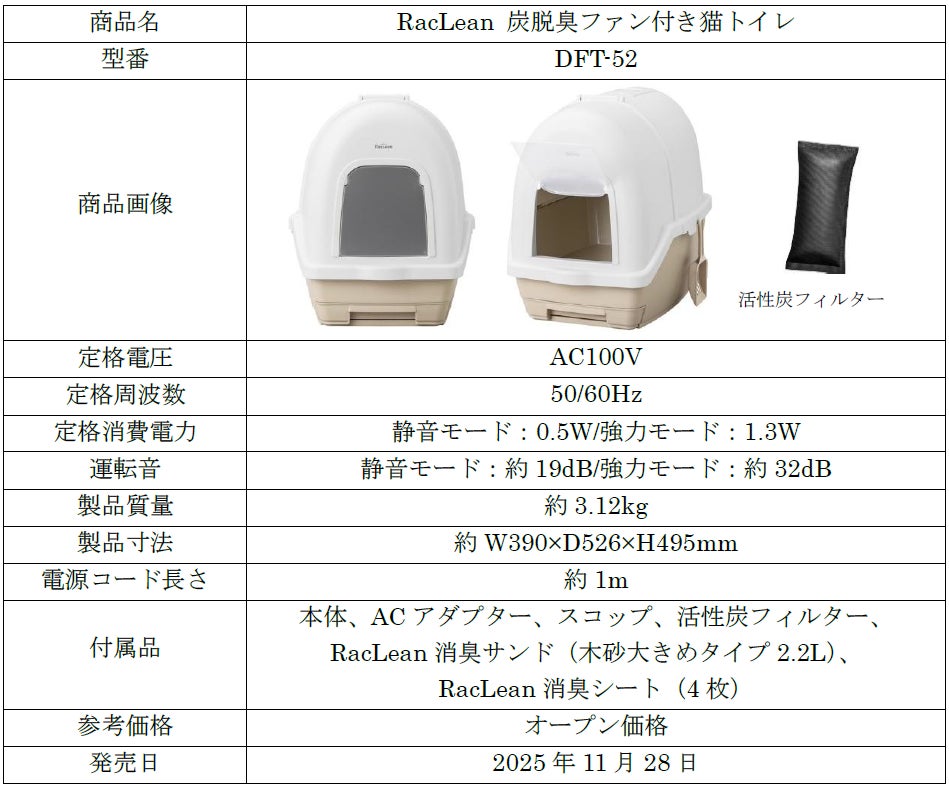 約4か月間(※1)、ウンチ・オシッコ臭を99%強力脱臭(※2) 「RacLean(ラクリーン) 炭脱臭ファン付き猫トイレ」を発売