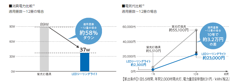 蛍光灯器具からLEDシーリングライトに変えると節電、省エネにもつながります。