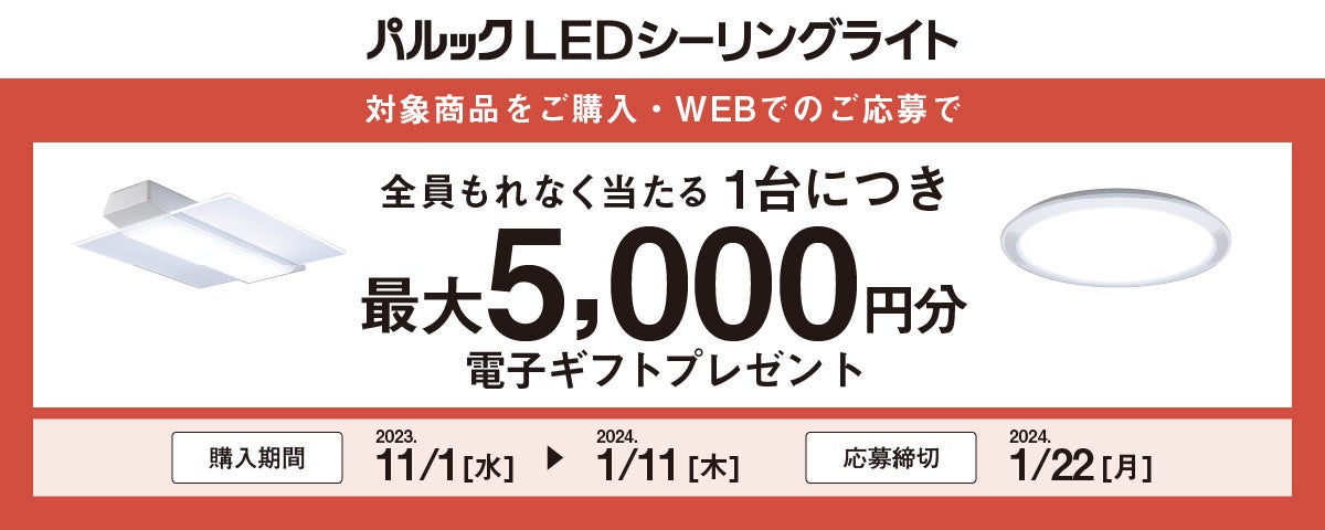 <11/1よりスタート>パルック LEDシーリングライト 電子ギフトプレゼントキャンペーン実施!対象のLEDシーリングライトを購入してWEBで応募するともれなく全員に応募台数分の電子ギフトをプレゼント