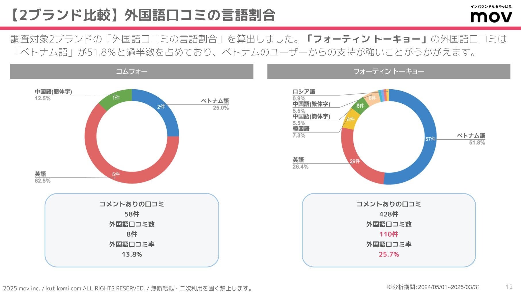 こちらのグラフでは、調査対象2ブランドの「外国語口コミの言語割合」を算出しています。「フォーティン トーキョー」の外国語口コミは「ベトナム語」が51.8%と過半数を占めており、ベトナムのユーザーからの支持が強いことがうかがえます。