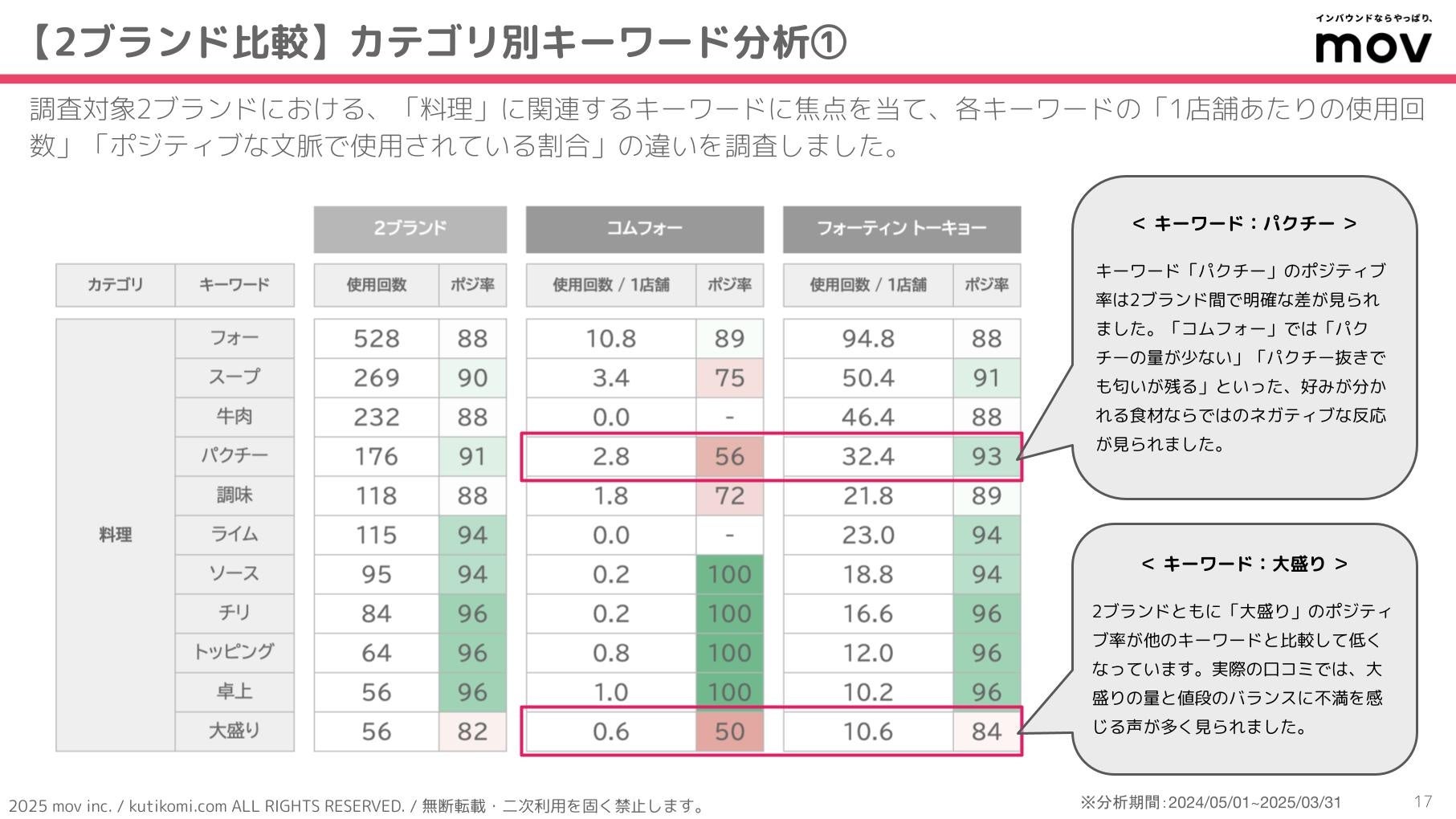 こちらの表では、調査対象2ブランドにおける、「料理」に関連するキーワードに焦点を当て、各キーワードの「1店舗あたりの使用回数」「ポジティブな文脈で使用されている割合」の違いを調査しています。