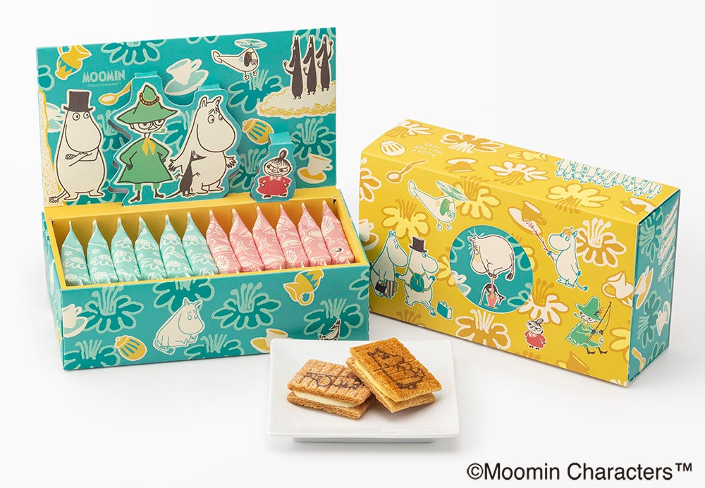 マスタードイエローとブルーグリーンの色使いが北欧デザインを感じさせる12個入はポップアップ付き!上手に穴が掘れなくて焦っているムーミンを、みんなが優しく見守っているような、愛嬌たっぷりのイラストがとってもキュートです。ふたを開けるとムーミンやスナフキン・リトルミイが飛び出してきます。みんなそろって何か話し合いをしているのかな?何をお話ししているのか想像するのも楽しい、遊びゴコロあふれるボックスです。「ムーミン シュガーバターサンドの木」と「アップルジンジャーのブリュレ仕立て」の2種類が詰合せになっているので、贈り物にもおすすめ。ムーミンが大好きなお友達へ、元気も一緒に届けるサプライズギフトに!