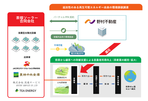 茶畑ソーラー合同会社が静岡県内の茶畑で「営農」と「発電」を両立させた営農型太陽光発電所1.8MW(DC)を開発し、野村不動産は、この発電所から創出された追加性(3)のある再生可能エネルギー電力の環境価値をバーチャルPPA 契約にて全量購入します。買い取り額の一部は営農委託報酬や農地賃借料として地域へ循環され、営農者の所得向上とともに、地域の農業基盤の維持・拡大に繋がります。本事業は茶畑ソーラー合同会社としてPPA 契約を締結する第一号案件であり、野村不動産としては初のバーチャルPPA 採用となります。