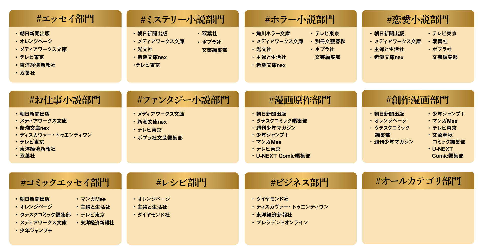 朝日新聞出版、オレンジページ、角川ホラー文庫(KADOKAWA)、タテスクコミック編集部(KADOKAWA)、メディアワークス文庫(KADOKAWA)、光文社、週刊少年マガジン(講談社)、少年ジャンプ+(集英社)、マンガMee(集英社)、主婦と生活社、新潮文庫nex(新潮社)、ダイヤモンド社、ディスカヴァー・トゥエンティワン、テレビ東京 、東洋経済新報社、双葉社、文藝春秋コミック編集部(文藝春秋)、別冊文藝春秋(文藝春秋)、プレジデントオンライン(プレジデント社)、ポプラ社文芸編集部(ポプラ社)、U-NEXT Comic編集部(U-NEXT)