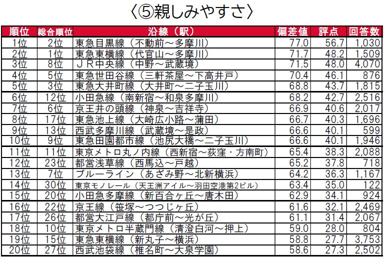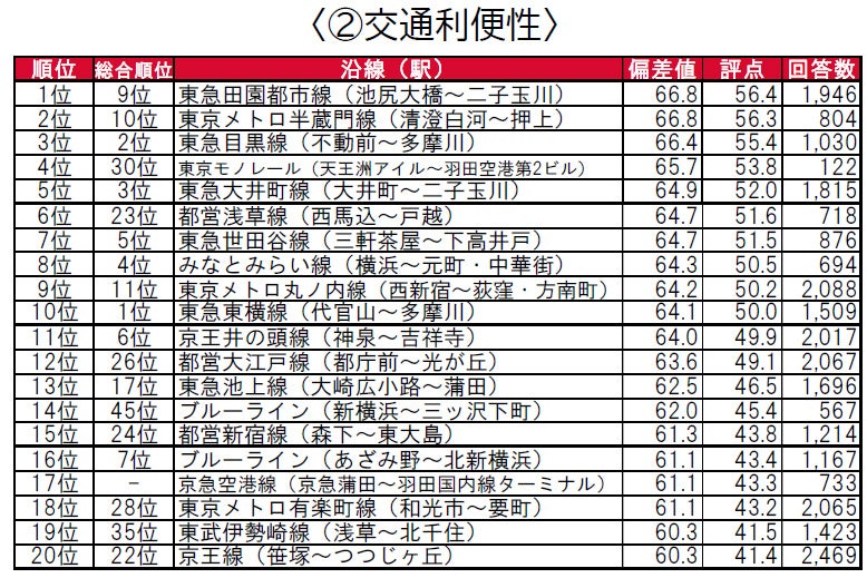 1位は、2年連続で東急東横線(代官山~多摩川)です。2位は東急目黒線(不動前~多摩川)(昨年3位)、3位は東急大井町線(大井町~二子玉川)(昨年7位)です。トップ3の沿線は全て東急線で、いずれも偏差値70台の極めて高い評価を得ています。