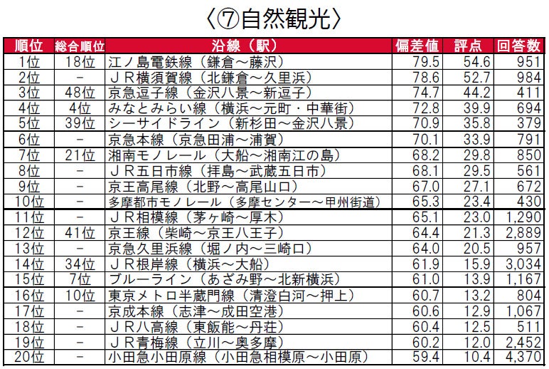 ●「自然観光」因子の1位は、江ノ島電鉄線(鎌倉~藤沢)です。トップ3の沿線は、3年連続で同じ顔ぶれで、神奈川県の海沿いの観光地を通る沿線の評価が引き続き高い評価となっています。