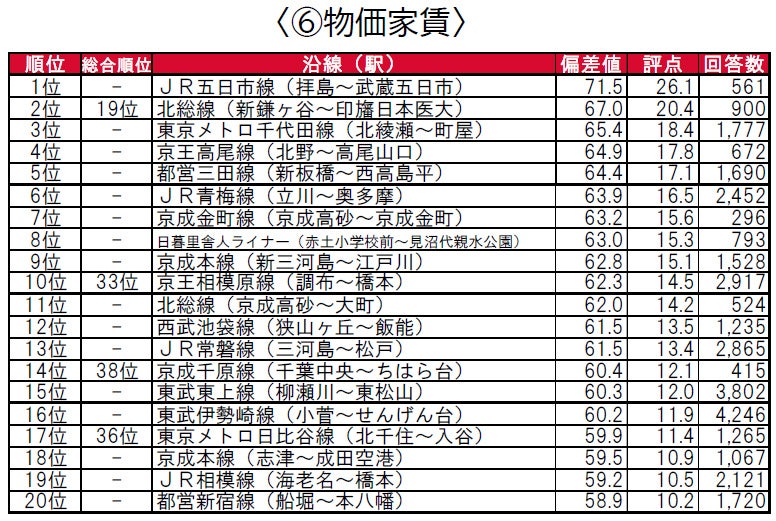 ●「物価家賃」因子の1位は、JR五日市線(拝島~武蔵五日市)で、唯一偏差値70台の極めて高い評価を得ています。
