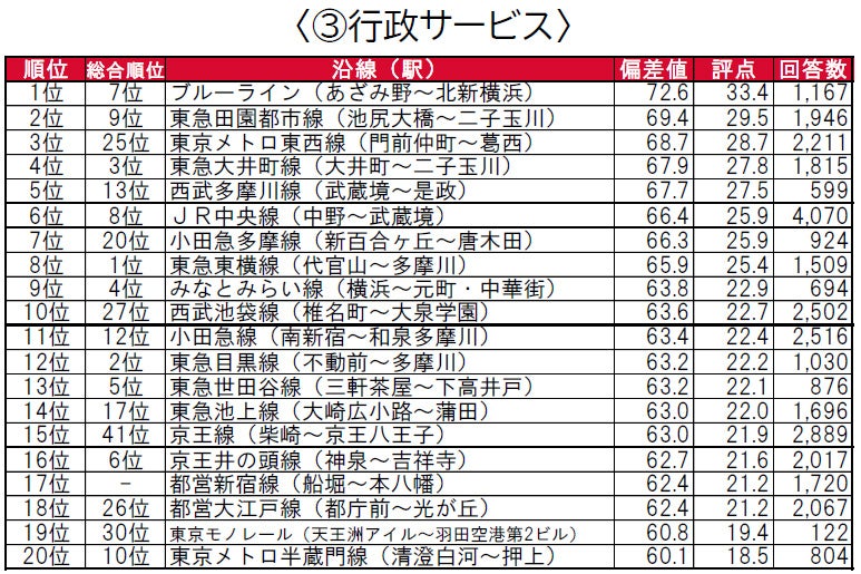 ●「行政サービス」因子の1位は、ブルーライン(あざみ野~北新横浜)で、唯一偏差値70台の極めて高い評価を得ています。
