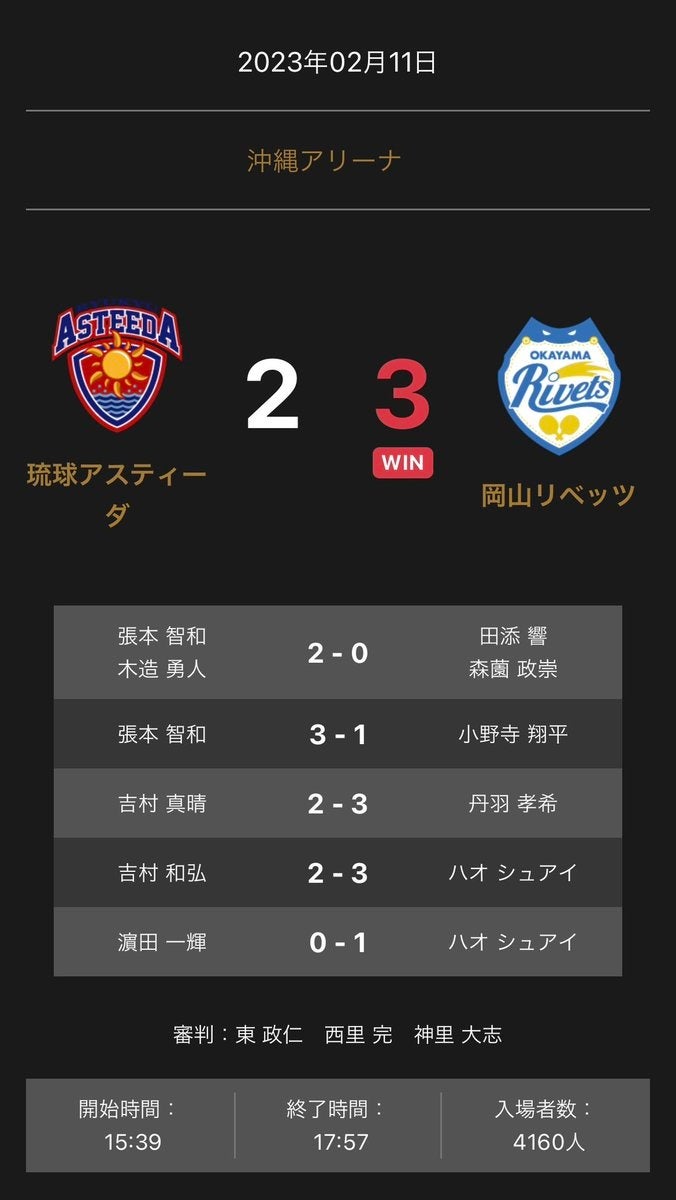 琉球アスティーダ vs 岡山リベッツの試合は 2-3で岡山リベッツが勝利しました。