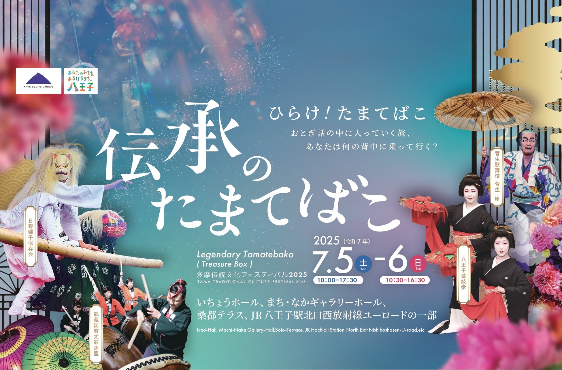 公益財団法人東京都歴史文化財団 アーツカウンシル東京、八王子市、公益財団法人八王子市学園都市文化ふれあい財団が主催する「伝承のたまてばこ~多摩伝統文化フェスティバル2025~」を2025年7月5日(土)、6日(日)の2日間にわたり、八王子市芸術文化会館(いちょうホール)をメイン会場に、JR八王子駅北口エリアで開催します。八王子や多摩地域に伝わる伝統文化・芸能の魅力を気軽に鑑賞・体験できる機会として実施する「伝承のたまてばこ~多摩伝統文化フェスティバル2025~」。誰でも気軽に参加できるような仕掛けや催し物をたくさんご用意してお待ちしています!