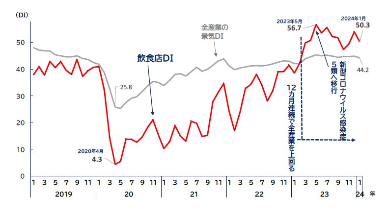 2023年3月にマスクの着用が個人の判断に委ねられることとなり、行動制限が緩和されたことで、飲食店DIは同年4月に50.8と景気の良し悪しの判断基準となる50を超えた。新型コロナウイルス感染症が5類へ移行した5月には、全産業の景気DIを11.3ポイント上回り、過去最高の56.7を記録。直近の2024年1月の飲食店DIも50.3となり、50を上回った。