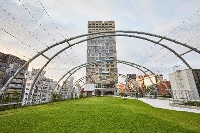広大な屋上には、200m陸上トラックやテニスコート、3x3のコートを有する「スポーツパーク」や、フットサルコート3面を有する「フットボールパーク」とともに、施設全体で約12,000㎡規模のスポーツの拠点を形成。なお、「スポーツパーク」には広々とした人工芝エリアを設けるほか、スポーツや映画・音楽コンサートなどのパブリックビューイングが開催できる大型LEDビジョンも設置し、幅広い楽しみ方が可能。