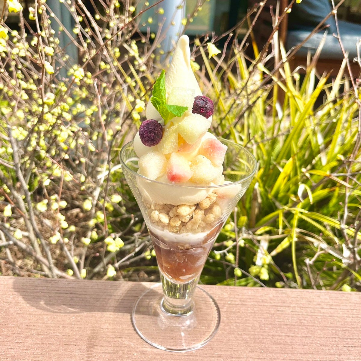 食材:アールグレイ寒天/ミルク/ラべンダーシロップ/グラノーラ/ソフトクリーム/ピーチ/ブルーベリー