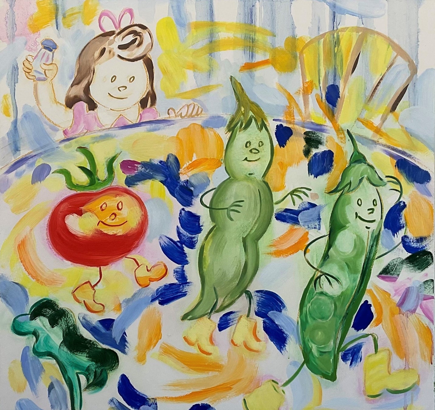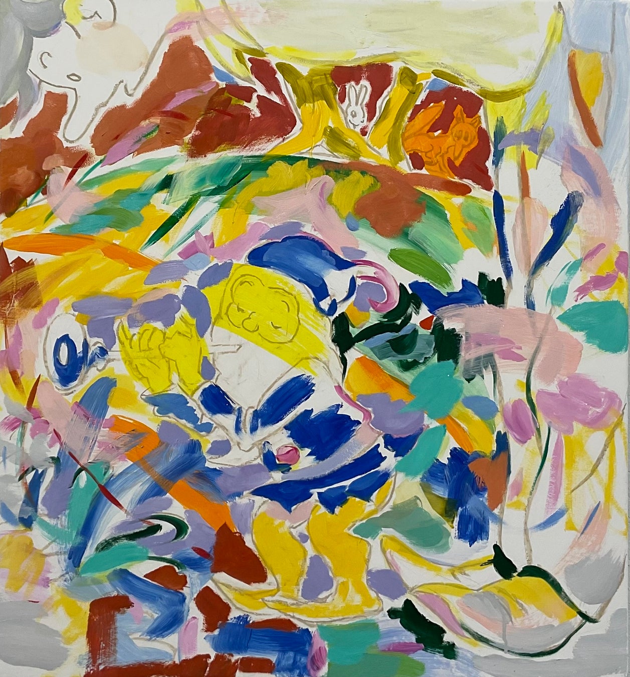 私は絵本や図鑑などをインスピレーション源として制作をしています。親しみのもてるキャラクターを想像の物語に引き入れてドローイングをつくり、その線画をペインティングにする過程で色彩と筆跡が画面を横断し、具象性と抽象性が混在した別の全体性へと更新させます。本展の新シリーズでは余白を多用しています。白色が色彩間の関係をつなぐと同時に、絵画内の奥行きを後退させたり逆に押し戻したりします。画面に放り出したイメージ、筆跡、色、余白が渾然一体となり、観る人の視線を自由に遊ばせることができればと思います。
