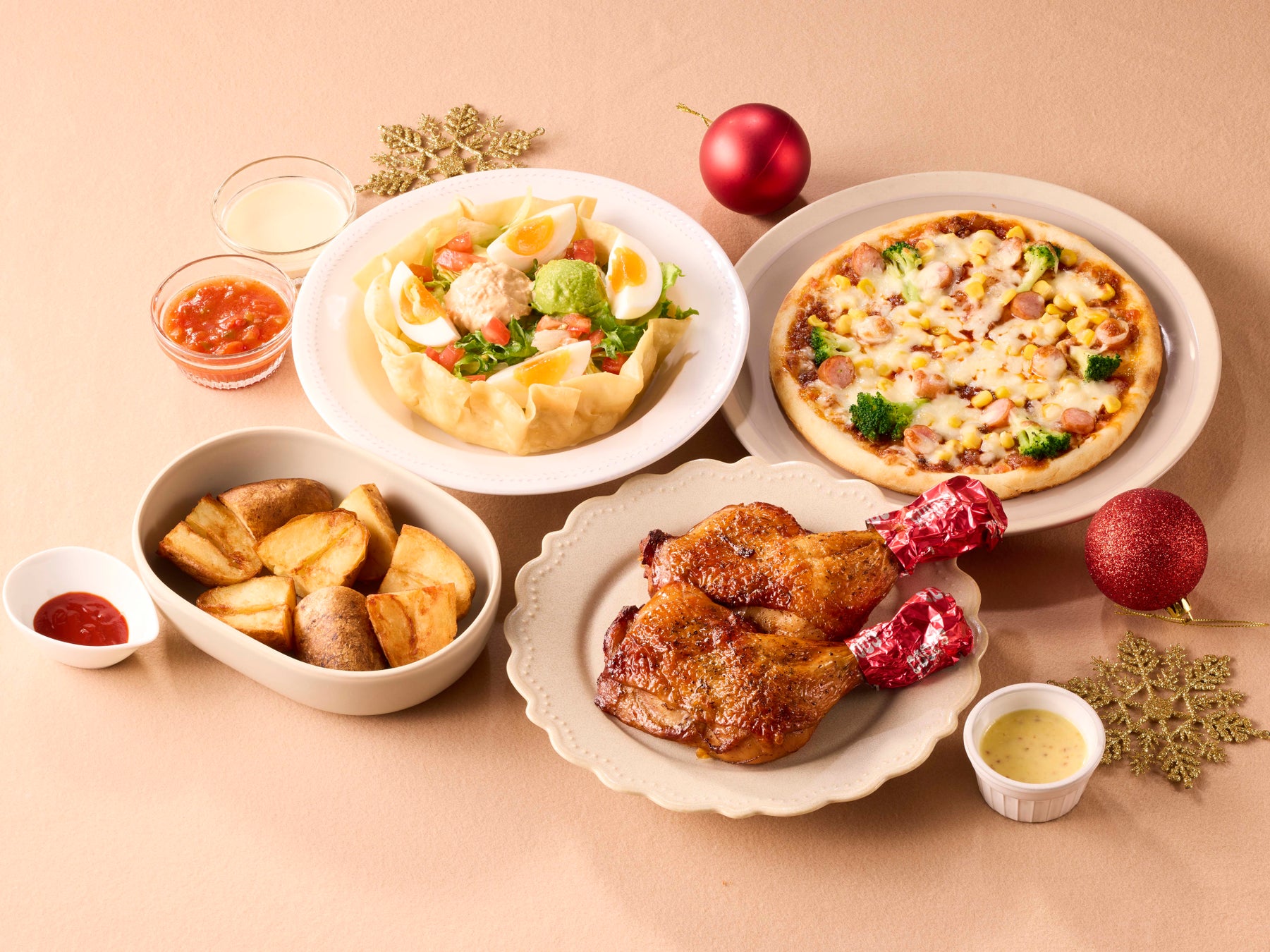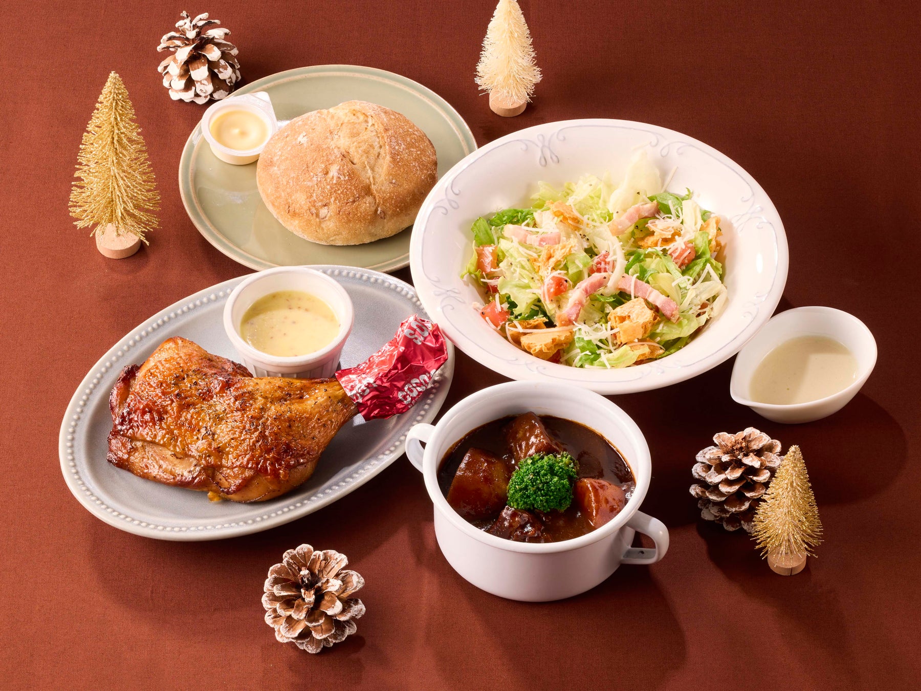 「ココスのクリスマス2025」では、ココスの看板商品“包み焼きハンバーグ”をはじめ、季節限定の包み焼きハンバーグやピッツァ、おこさまから大人まで楽しめるまろやかな味わいのハニーマスタードソース※1が付いた骨付きローストチキン、ほくほくのポテト、カリフォルニアタコサラダなどを組み合わせたお得なセットが登場します。各種セットは単品でご注文いただくよりも最大240円(税抜)お得なうえ、公式HPよりネットでご注文をしていただくと全品10%オフでご購入いただけます。