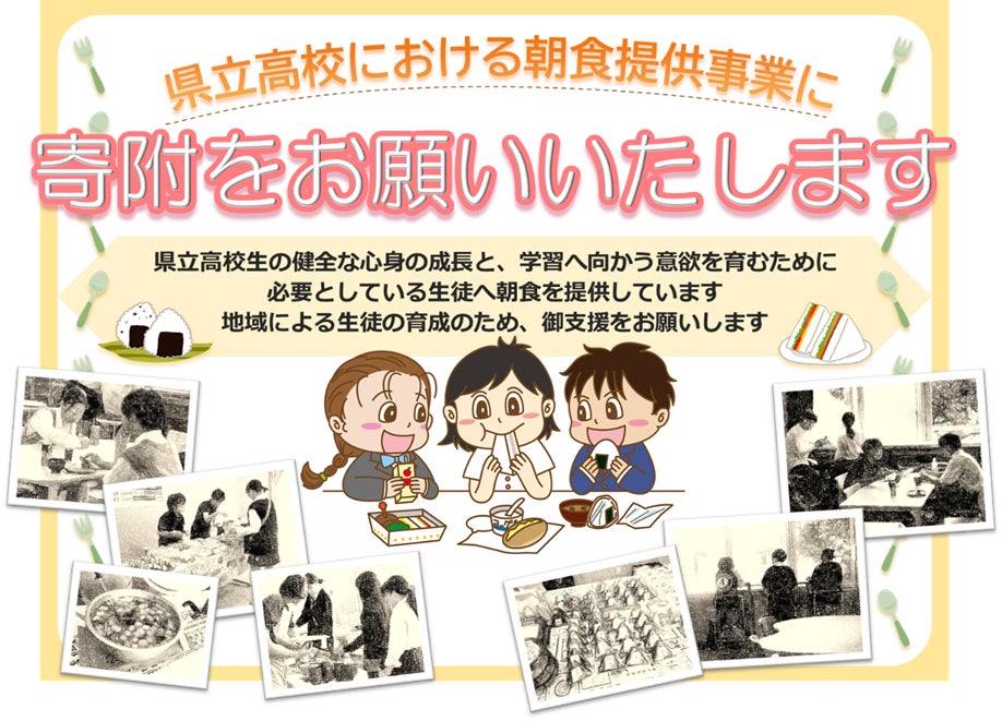 令和5年度に引き続き、県立高校4校で実施している朝食提供事業を充実させるため、寄附募集を実施いたしますので、ご寄附をお願いします。