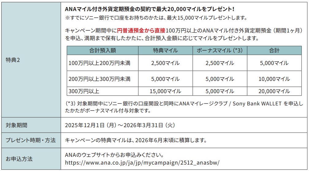 ソニー銀行株式会社(代表取締役社長:南 啓二/本社:東京都千代田区/以下 ソニー銀行)は、全日本空輸株式会社(代表取締役社長:井上 慎一/本社:東京都港区/以下 ANA)と「ANAのマイル獲得チャレンジ 最大40,000マイルプレゼントキャンペーン」を2025年12月1日(月)より実施しますので、お知らせします。