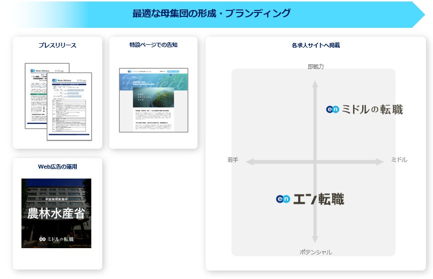 プレスリリースや特設ページ、Web広告での告知に加え、各求人サイトでの集客支援を実施。『エン転職』『ミドルの転職』とターゲットの異なる2つの求人サイトを活用することで、ターゲットへ網羅的に求人を届けました。