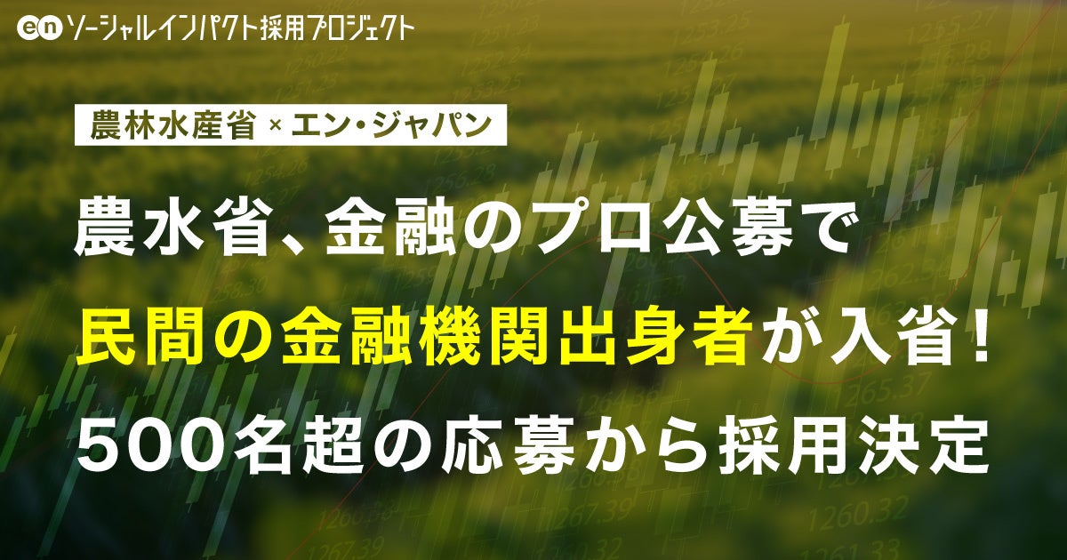 そこで、エン・ジャパンのご支援のもと経験者を募集した結果、583件の応募があり、豊富な知識や経験を有する1名の方を採用することができました。今回入省された方には、これまで培われてきた金融業界の知識を共有いただき、農林水産省の検査官としてご活躍されることを期待しています。
