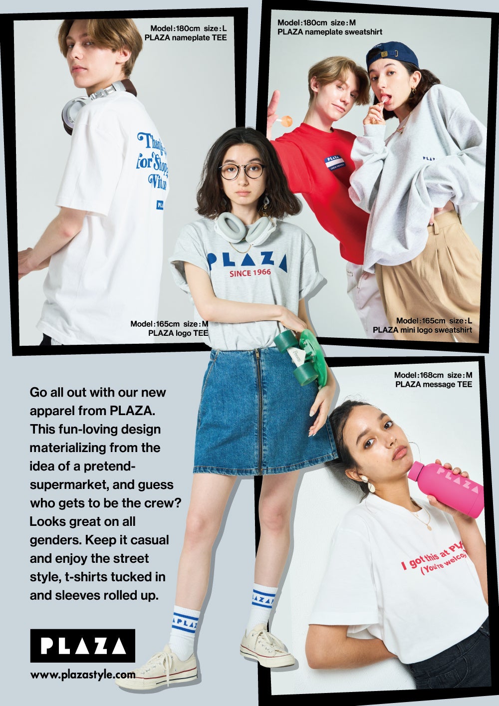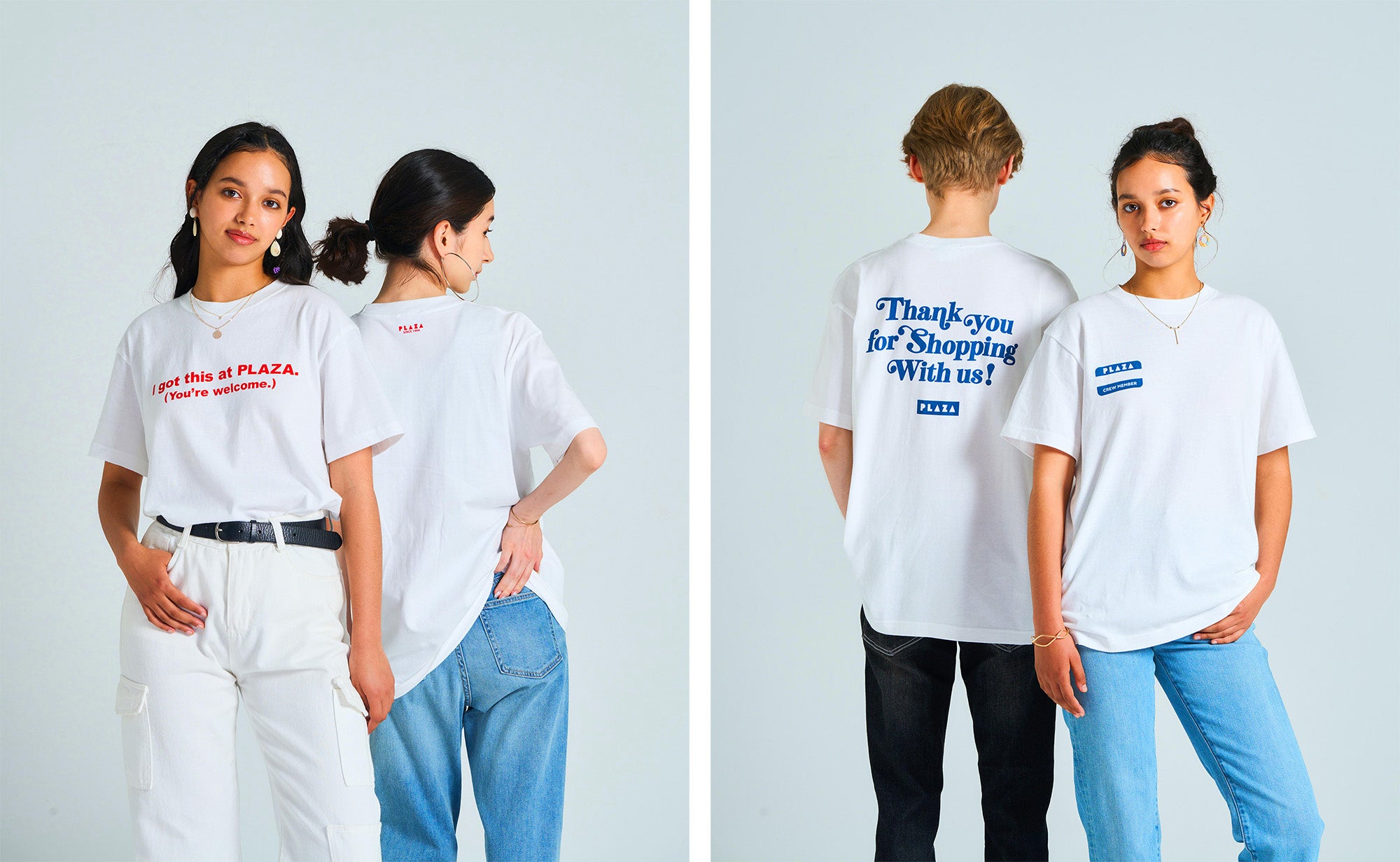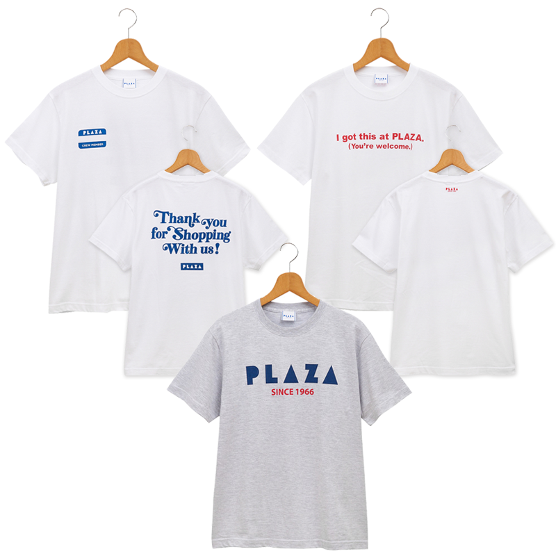 中でも注目は、Tシャツ(全3種)とスウェット(全4種)!ショッピングにまつわる英字のメッセージや、ネームバッジ風の胸元プリント、そしてやっぱりハズせないPLAZAロゴと、どれもユニークなデザインです。Tシャツはベーシックに使えるMサイズ(※オンラインストア限定で、2種のみLサイズも展開)。スウェットは、デザインによってM/Lとサイズが異なり、ユニセックスで着用できるアイテムです。お好みのサイズ感でチョイスするのもおすすめ!