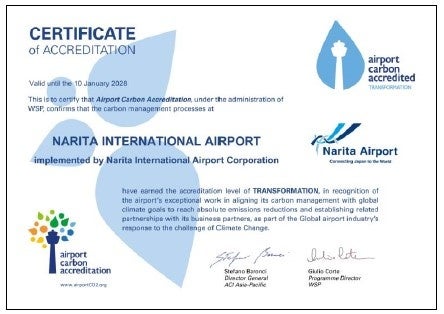このたび、成田空港は、空港カーボン認証(Airport Carbon Accreditation)*¹プログラムにおいて、脱炭素化に向けた取り組みが世界的に評価され、レベル4を取得しました。