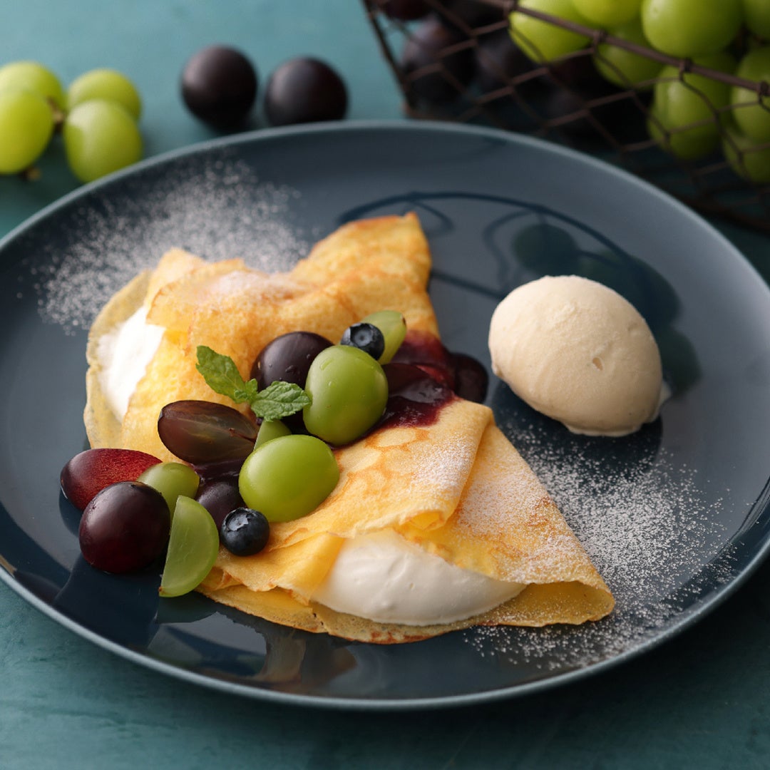 焦がしバターを加えて焼いた自家製クレープに、クレーム・シャンティを包みました。2種類の葡萄と共に、甘酸っぱい巨峰のソースでお召し上がりください。