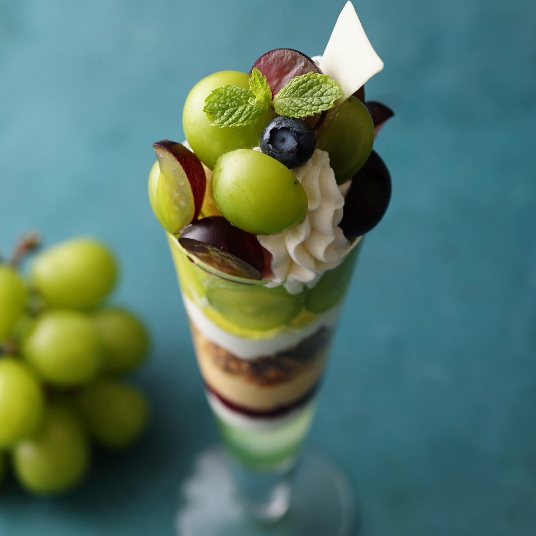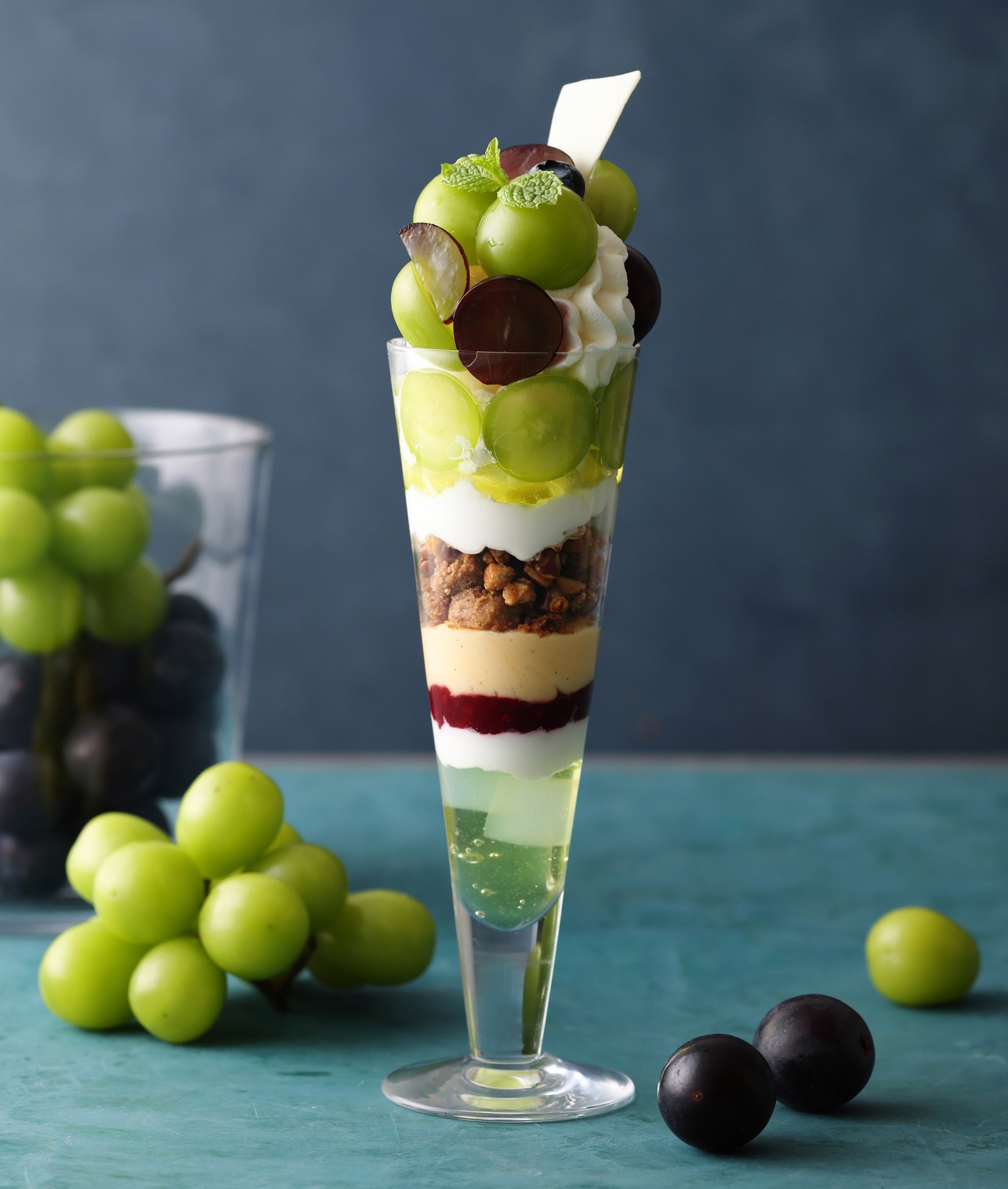 2種類の葡萄を盛り込んだパフェ。シャインマスカットのジュレ、フランボワーズのコンフィチュール、ディプロマットクリーム、クランブル、プラリネ、バニラアイスなどを何層にも重ねました。