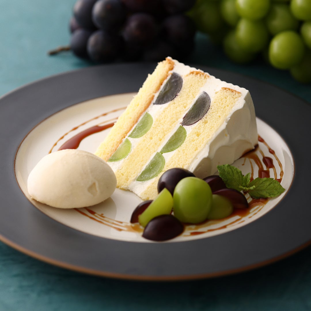 フレッシュのシャインマスカットと巨峰を生クリームとスポンジでサンドしたシンプルなショートケーキ。バニラアイスを添えて。