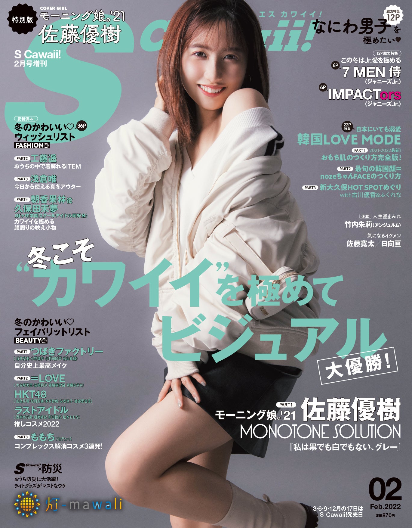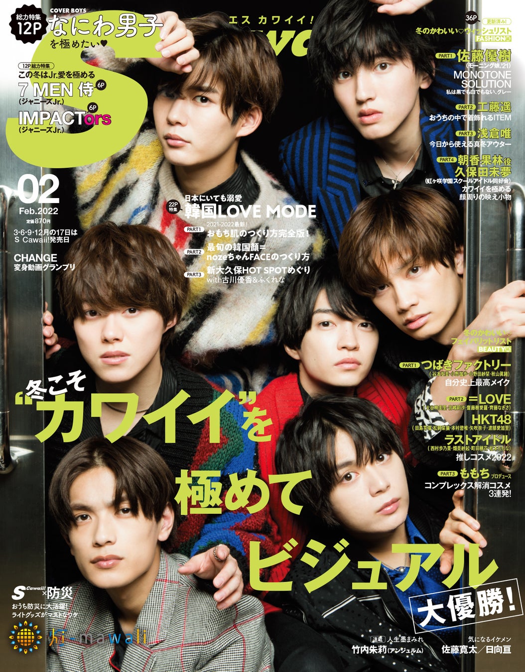 2022年2月号となるS Cawaii!の表紙を飾るのは、なにわ男子(西畑大吾、大西流星、道枝駿佑、高橋恭平、長尾謙杜、藤原丈一郎、大橋和也)の7人とモーニング娘。‘21を12月13日に卒業したばかりの佐藤優樹。