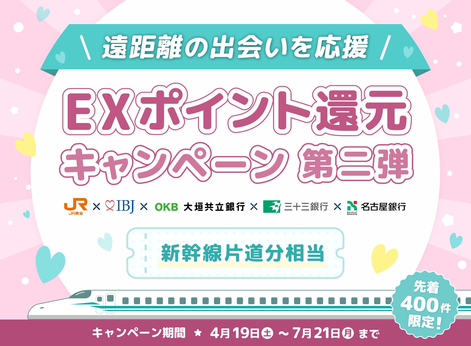 IBJまたはIBJ加盟相談所が運営するお見合いやデートで、EXサービス(「エクスプレス予約」または「スマートEX」)を利用して東海道新幹線を往復した場合、片道分の利用代金相当の「EXポイント(限定)」 を還元します。キャンペーン期間は2025年4月19日(土)~7月21日(月)で、お一人様最大3回まで申請可能、先着400回までポイント還元の対象となります。