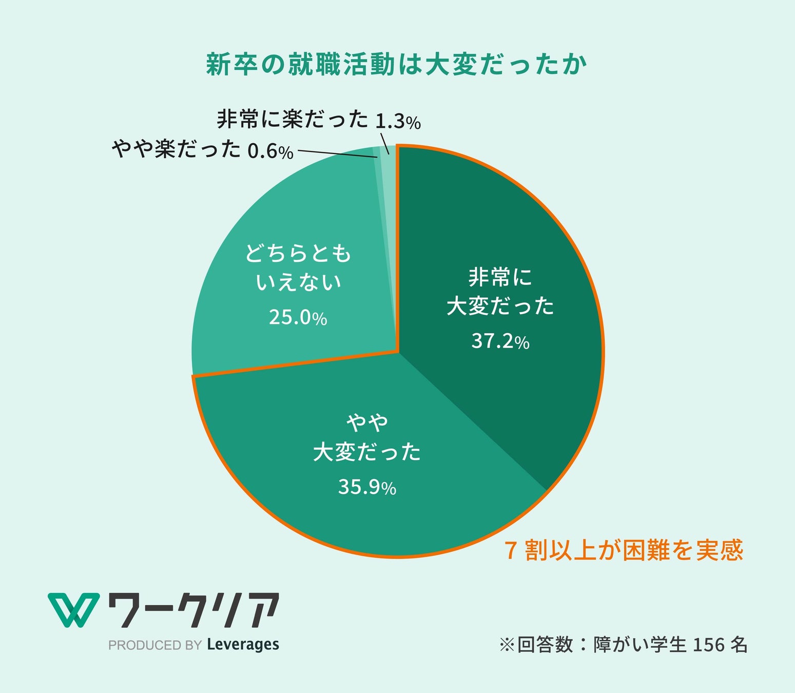 レバレジーズ株式会社が運営する障がい者就労支援サービス「ワークリア」( https://worklear.jp/ )は、障がいのある学生の就職活動の実態を明らかにするため、障がい者手帳を所持し※1、新卒での就職活動の経験がある156名を対象に、障がい学生の就職活動に関する実態調査を実施しました。
