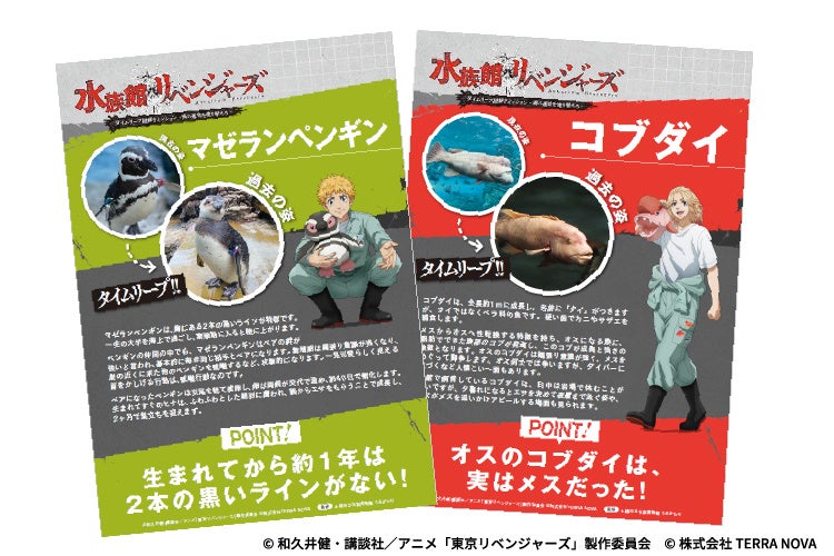館内各所に生きものに関する解説パネルを設置します。生きものの生態のほか、『東京リベンジャーズ』のストーリーのカギとなる「タイムリープ」にちなんで、生きものの過去の姿(成長前)について紹介します。