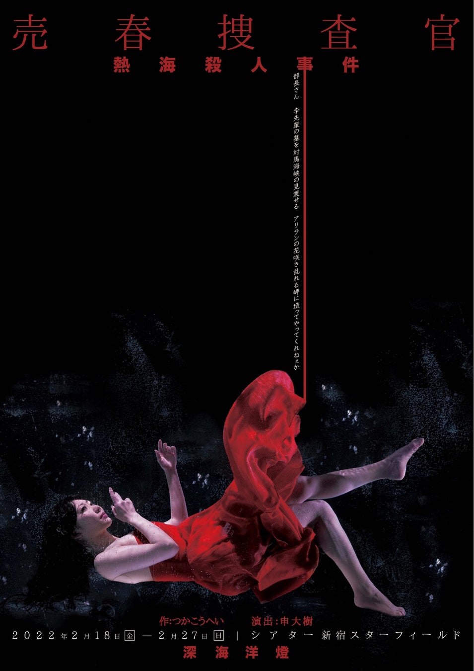 深海洋燈の代表、申大樹の恩師であるつかこうへい氏の不朽の名作、熱海殺人事件「売春捜査官」。本作品はつかこうへい氏が生前、いくつものバージョンであらゆる役者によって社会に対するメッセージを伝えている。