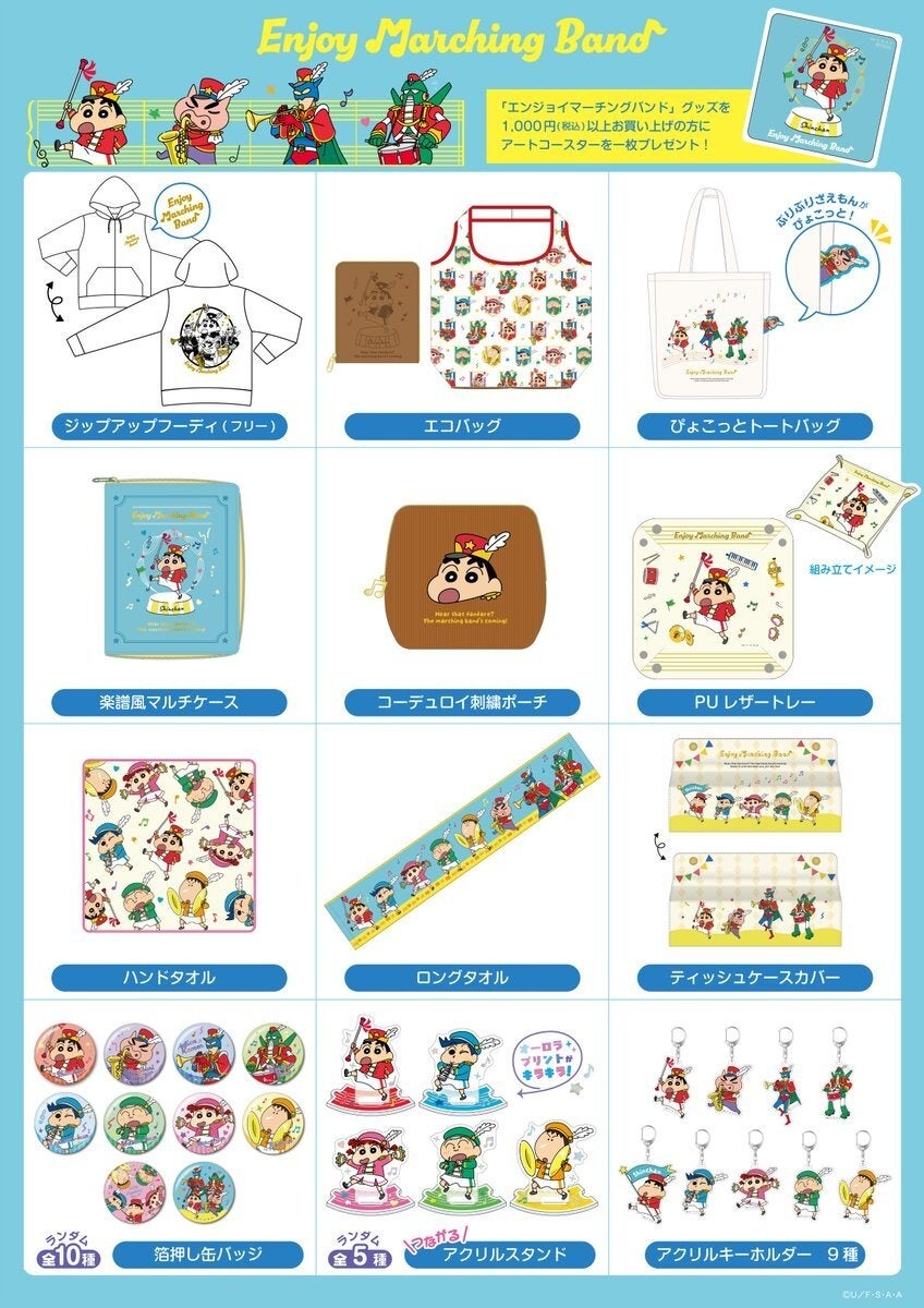 新規描き下ろしのテーマは『マーチングバンド』。しんちゃんや仲間たちが楽器を演奏して大行進! まるで演奏が聞こえてくるかのような楽しげなアートとなっています。発売されるグッズは、ぬいぐるみマスコットやタオル、ポーチ、ランチグッズなど、にぎやかでハッピーなラインナップ♪ さらに今回の新規描き下ろしを記念して渋谷パルコ6Fにて期間限定のPOPUPもスタートします。