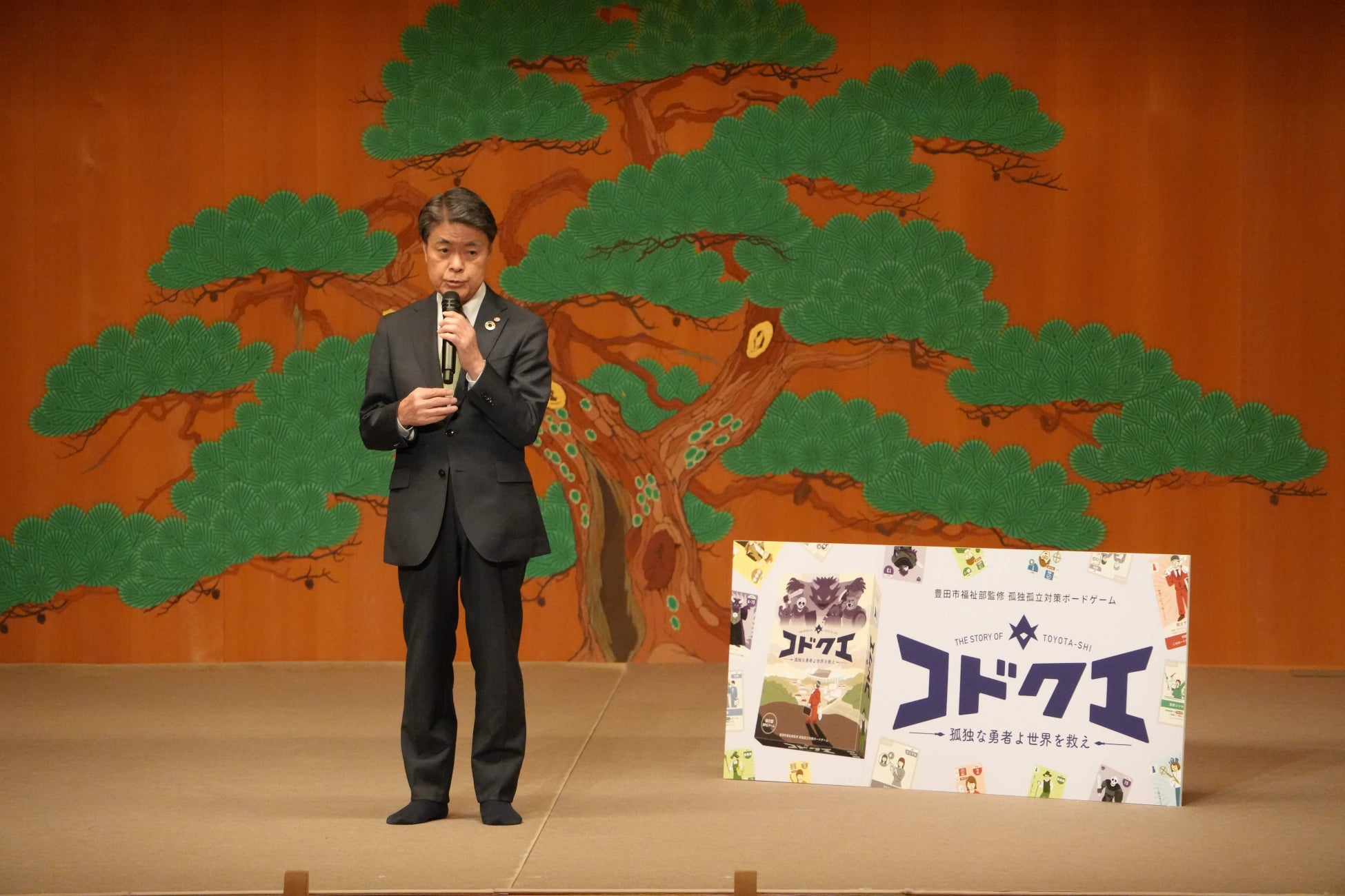 完成記念イベントでは、はじめに豊田市・太田稔彦市長が登壇。豊田市における孤独・孤立対策の概要について説明を行い、「孤独・孤立は誰にでも起こりうる」という視点から、地域の中で「人と人とのつながり」を育むことの重要性を強調しました。さらに、このようなメッセージを楽しく、わかりやすく伝えるための取り組みとして、ゲームを通じて自然にコミュニティ参加や協力の大切さを学べる「コドクエ」を企画したことを発表しました。