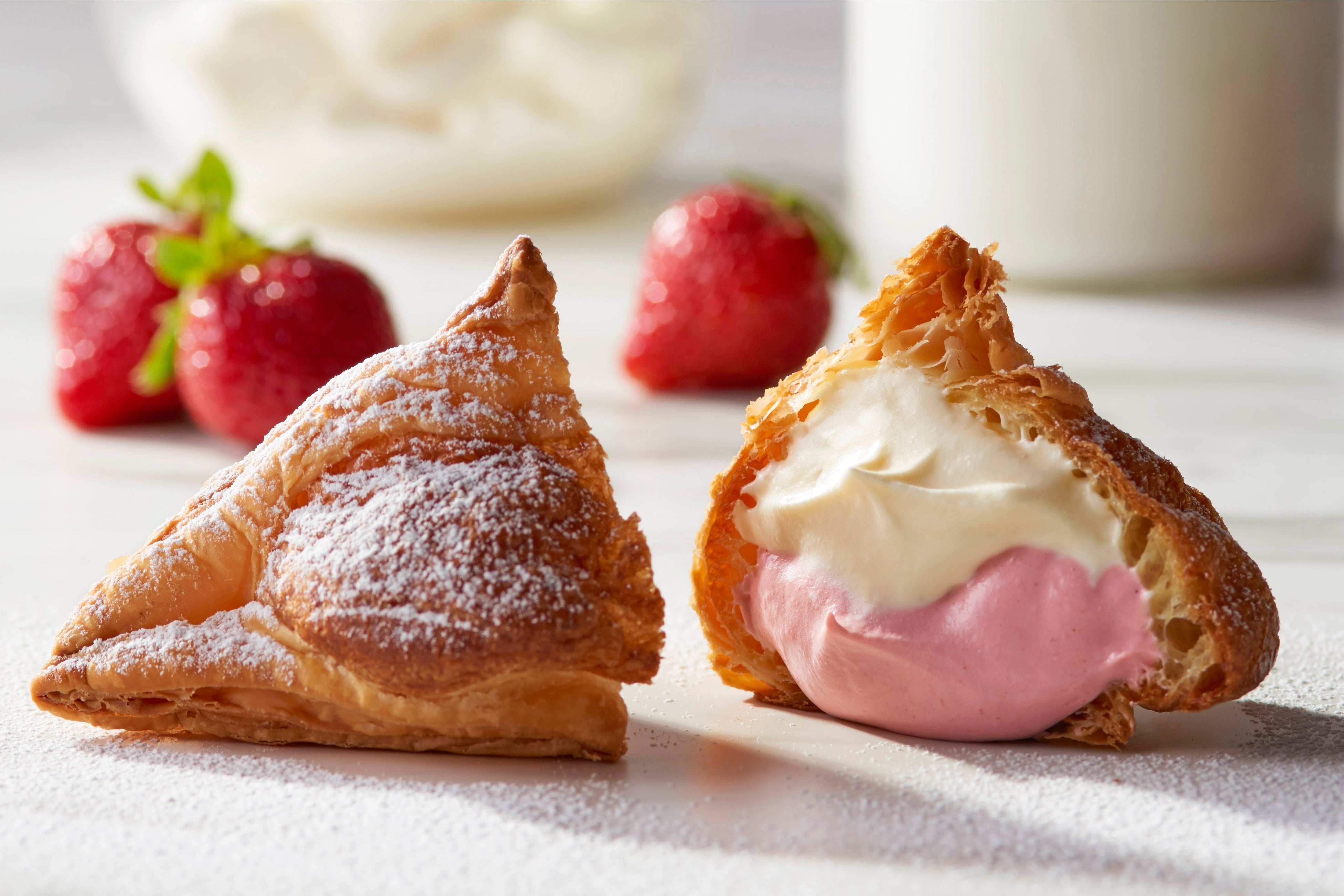 オーブンで焼き上げたサックサクのパイに、マスカルポーネチーズでまろやかに仕上げた北海道産のミルククリームと、いちごをぎゅっと加えた甘酸っぱいストロベリークリームのふたつのクリームを黄金比率で詰め込みました。