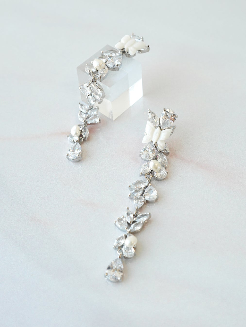 ウェディングドレスにもカラードレスにもぴったりのジルコニアアクセサリー。繊細なちょうちょモチーフと上品な淡水パールがアクセントとなり、きらきらと輝く中にも優しい雰囲気を漂わせます。