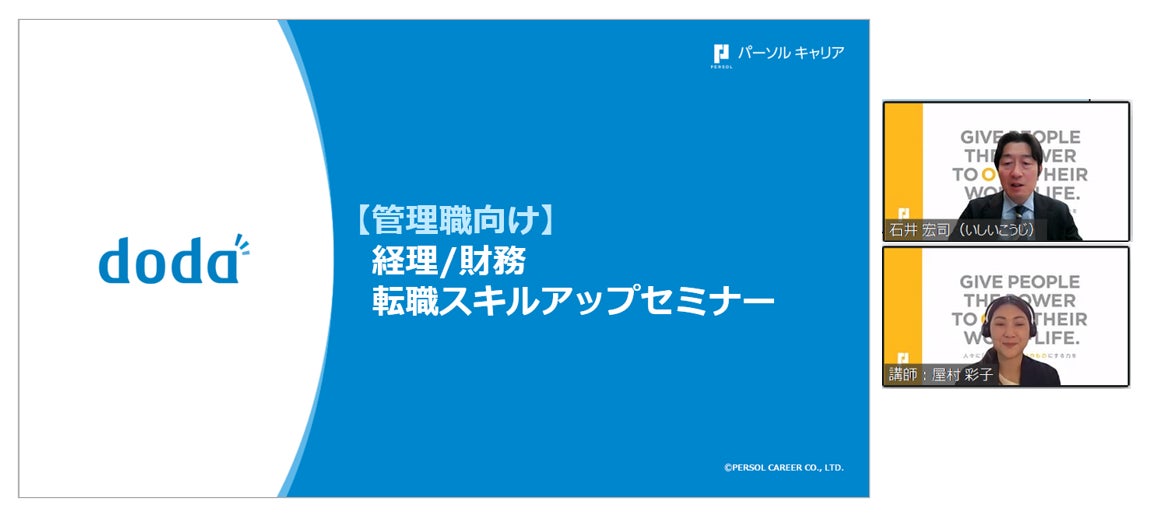 パーソルキャリア株式会社が運営する転職サービス「doda(デューダ)」は、管理職の転職希望者向け「経理/財務 転職スキルアップセミナー」を3月27日(木)に開催しました。講師として、ミドルシニア事業企画部の責任者である石井 宏司と、「doda」でキャリアアドバイザーを務める屋村 彩子が登壇し、経理・財務職にまつわる最新の転職市場動向や転職活動時の書類作成、面接のポイントなどを解説しました。本レポートではその内容を一部抜粋して紹介します。