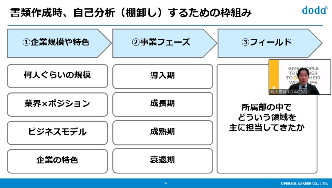 続いて、自己PRについて具体的なアドバイスをお伝えしました。自己PRを書く際のポイントは、2、3文の簡潔な文章ながらも「企業規模や特色」「事業フェーズ」「フィールド」の3つの情報を盛り込むことです。