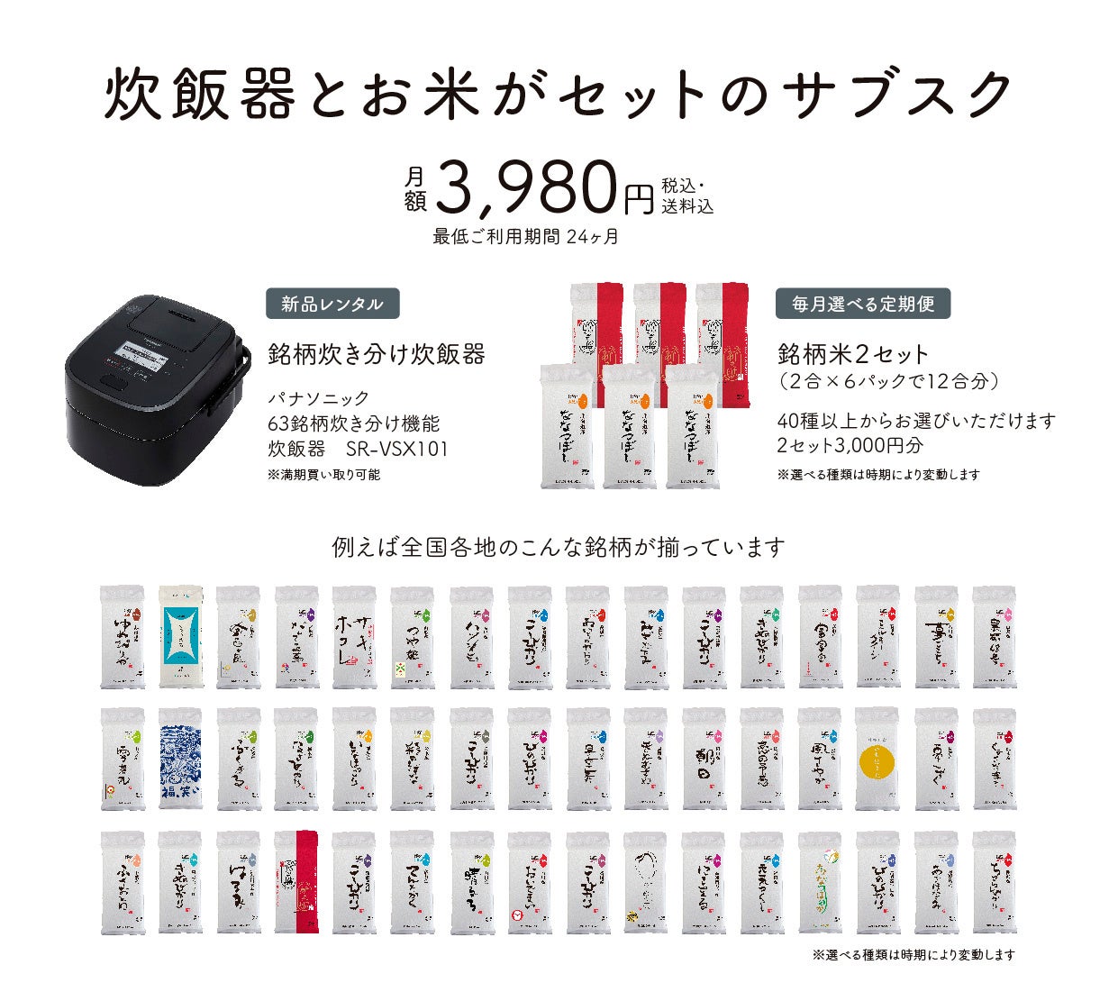【食材】銘柄米2セット(2合 x 3パックを2セットで12合分。銘柄は、毎月選択可能)