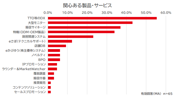 製品・サービスは、impact・eの 「TTO等のDX製品」 に注目が集まりました。続いて、外食・中食業界向けのimpact TVの大型モニターや販促サイネージも関心の対象となりました。「厨房」 で使用できるキッチンタイマーサイネージや、本部からの情報をお知らせするスタッフサイネージも好評でした。